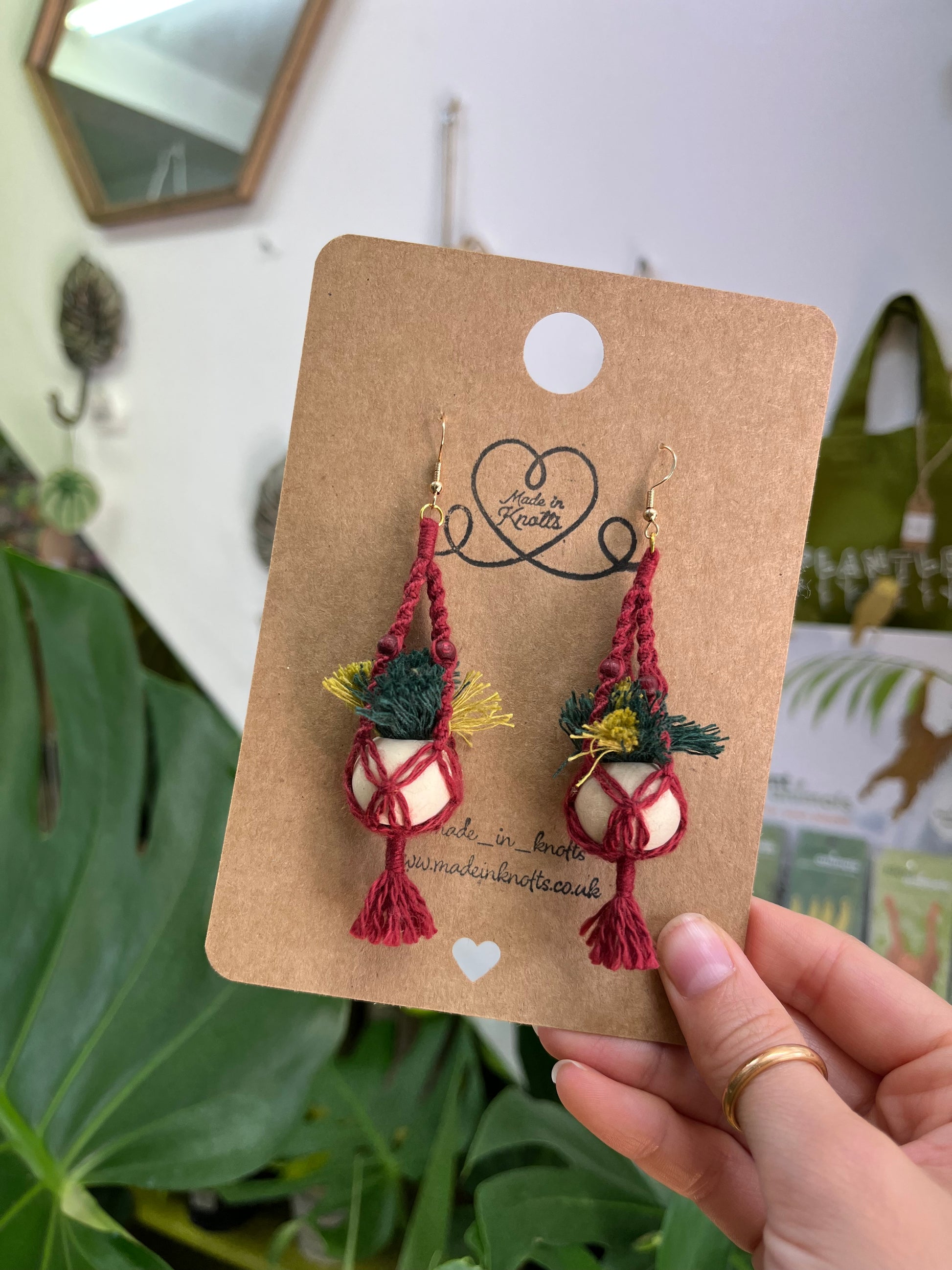 These tiny macramé plant hanger earrings are the perfect gift for plant lovers and craft lovers! Each pair is carefully knotted in Nottingham using 100% cotton cord and finished with a natural wooden bead, making them super lightweight!